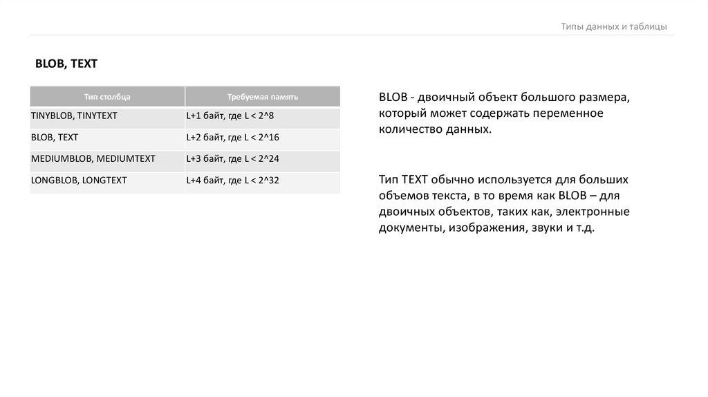 Типы данных и таблицыBLOB, TEXT