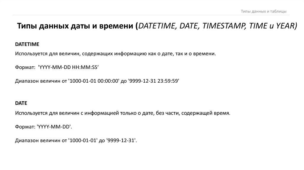 Типы данных и таблицыТипы данных даты и времени (DATETIME, DATE, TIMESTAMP, TIME и YEAR)