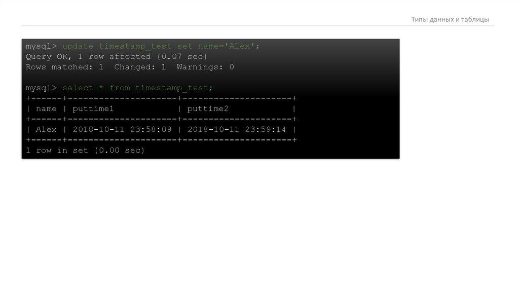 Типы данных и таблицыmysql> update timestamp_test set name='Alex';