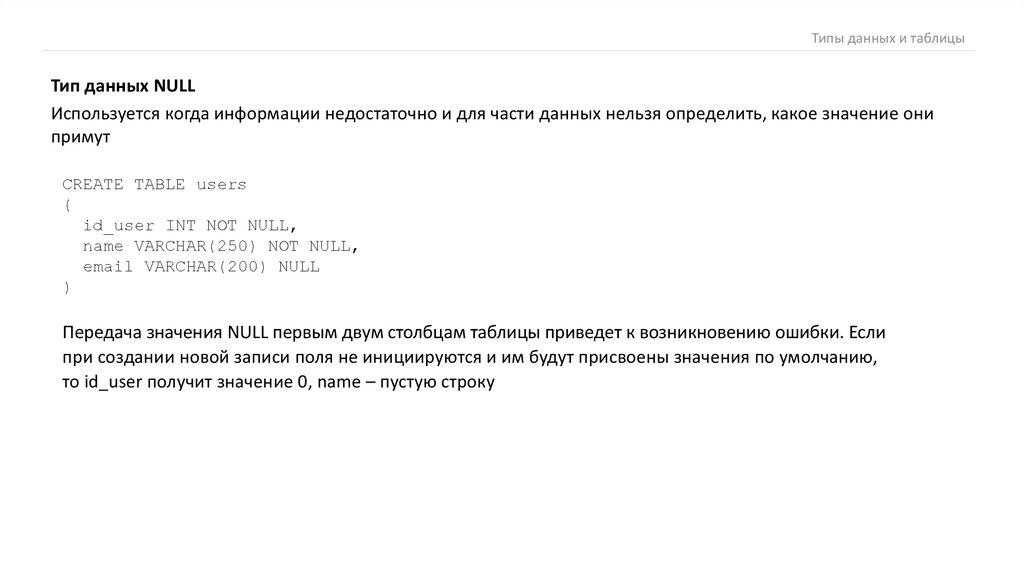 Типы данных и таблицыТип данных NULL