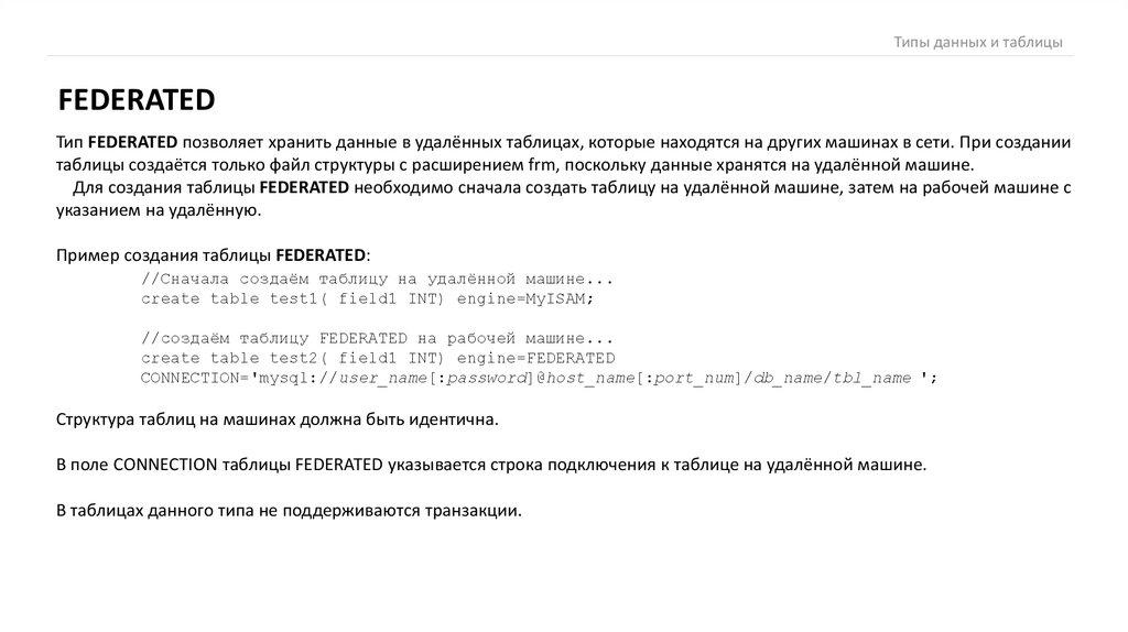 Типы данных и таблицыFEDERATED