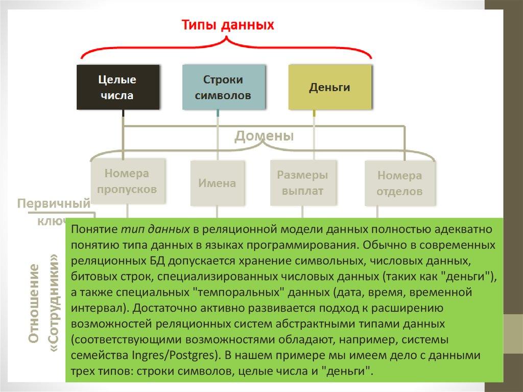 Понятие тип данных в реляционной модели данных полностью адекватнопонятию типа данных в языках программирования. Обычно в современных