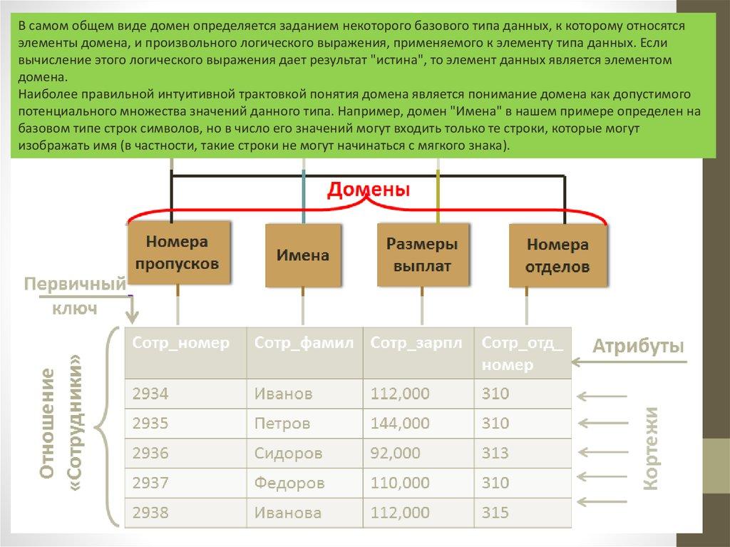 потенциального множества значений данного типа. Например, домен "Имена" в нашем примере определен на