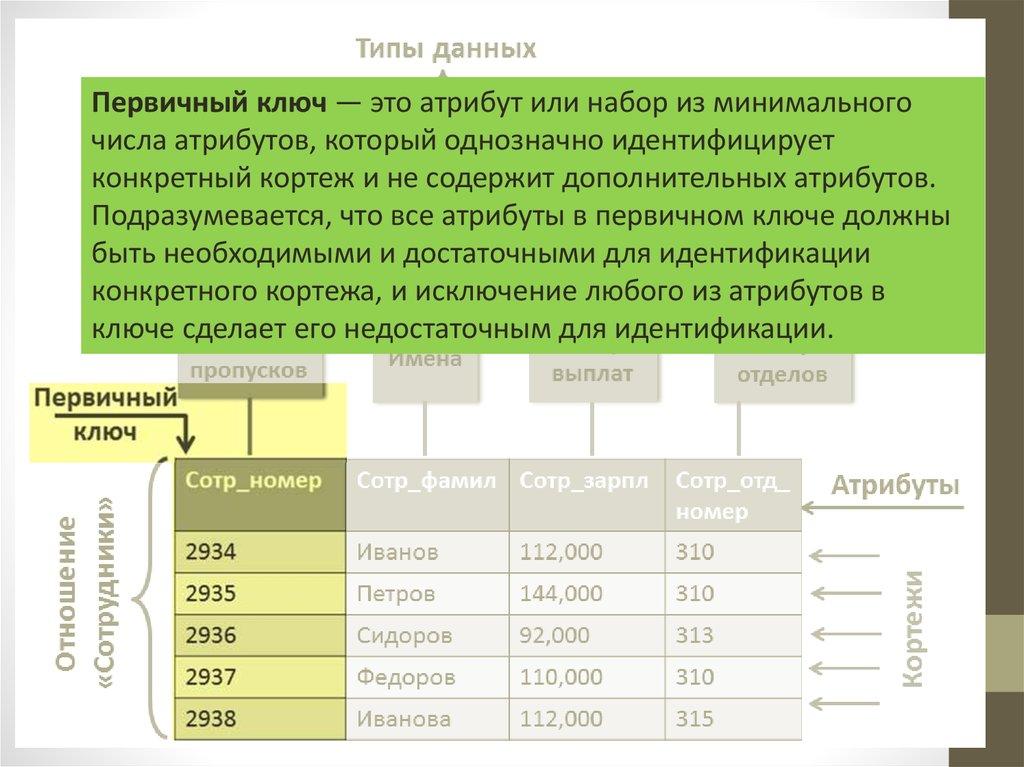 Первичный ключ — это атрибут или набор из минимальногочисла атрибутов, который однозначно идентифицирует
