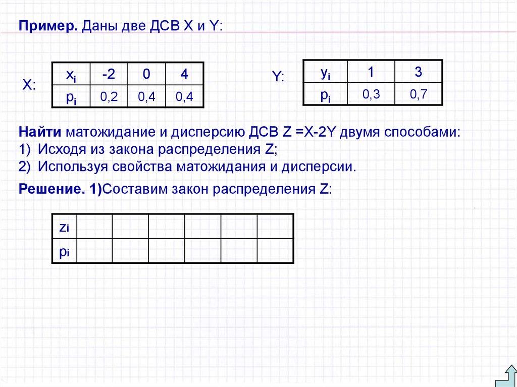 Найти матожидание и дисперсию ДСВ Z =Y-X двумя способами: