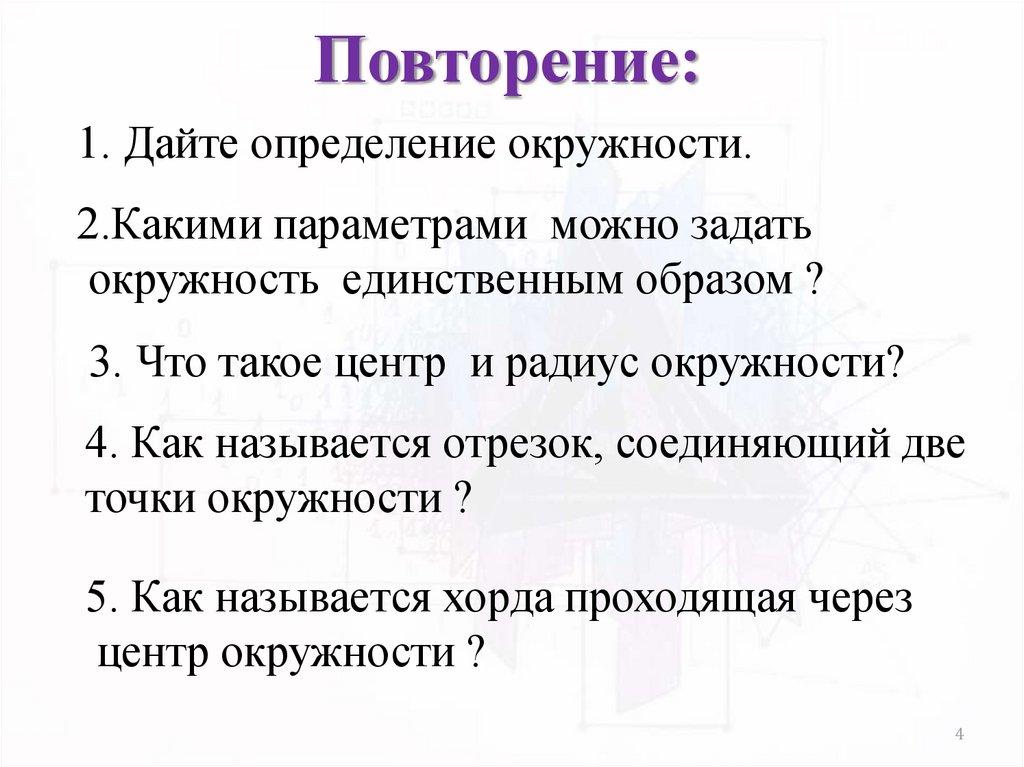 Повторение:1. Дайте определение окружности.