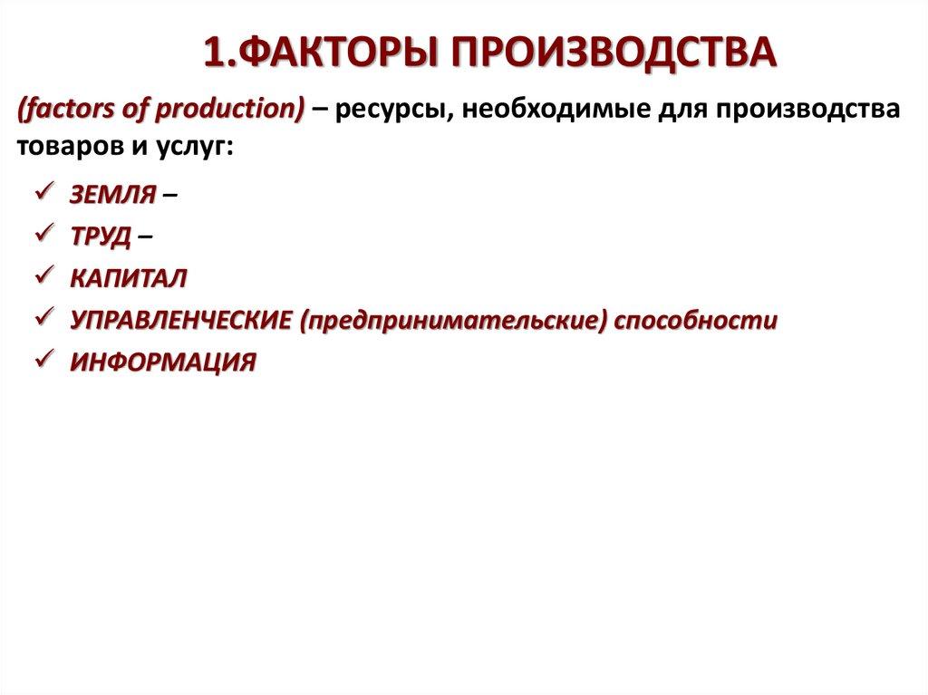 1.ФАКТОРЫ ПРОИЗВОДСТВА(factors of production) – ресурсы, необходимые для производства