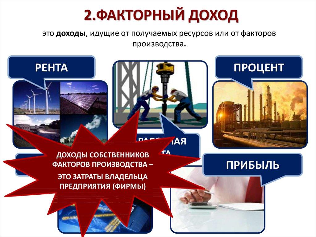 2.ФАКТОРНЫЙ ДОХОДэто доходы, идущие от получаемых ресурсов или от факторов