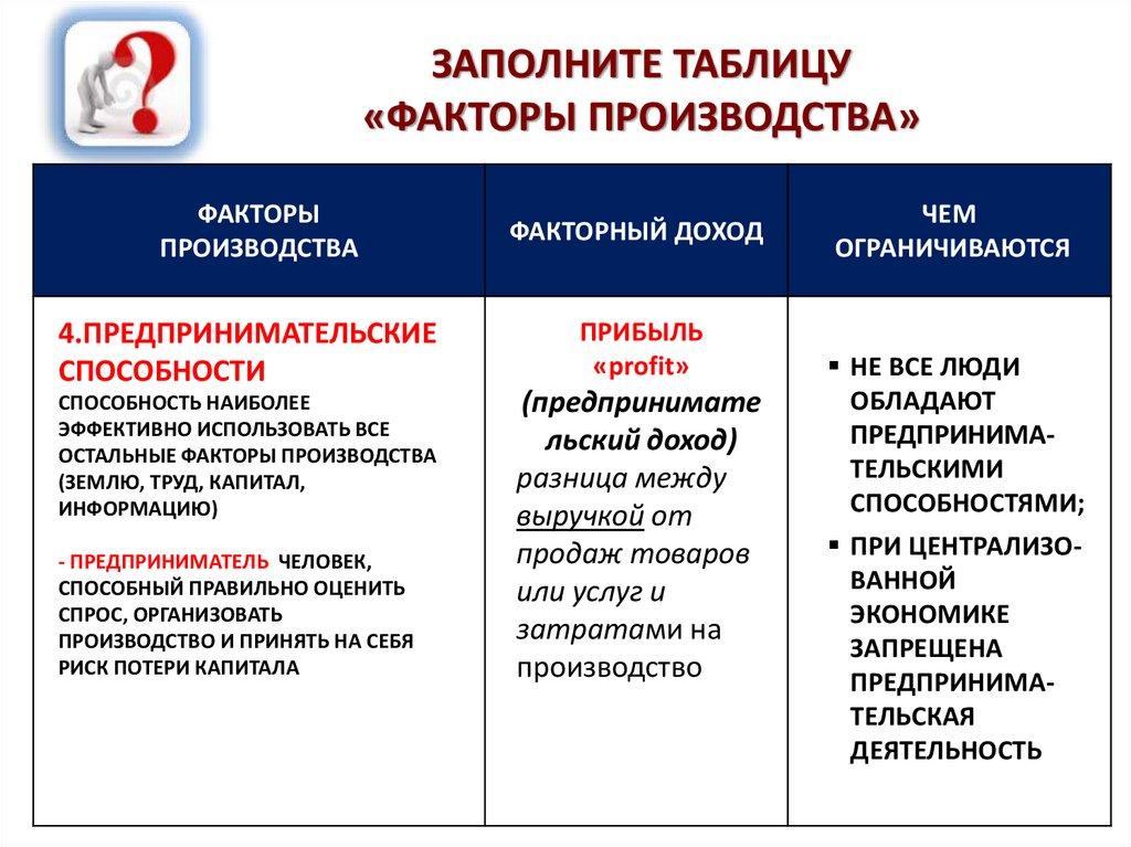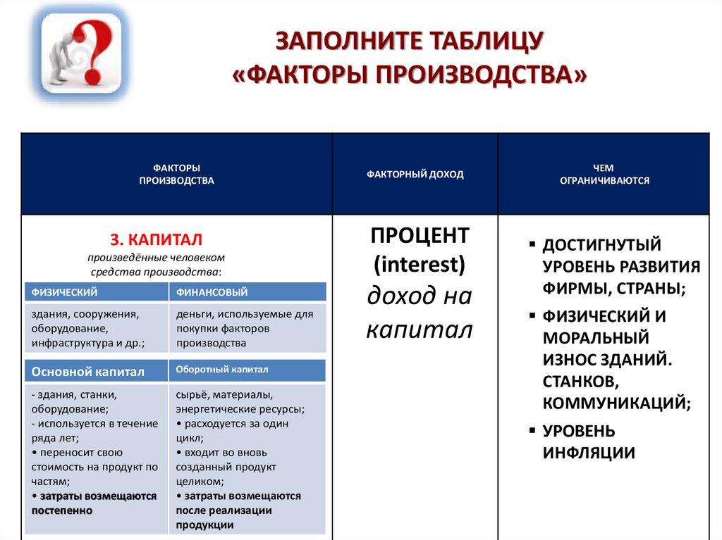 ЗАПОЛНИТЕ ТАБЛИЦУ«ФАКТОРЫ ПРОИЗВОДСТВА»