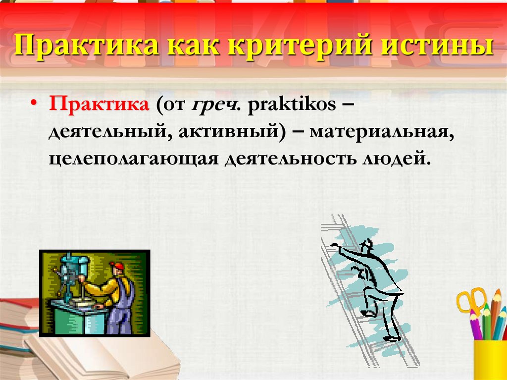 Практика как критерий истины• Практика (от греч. praktikos –