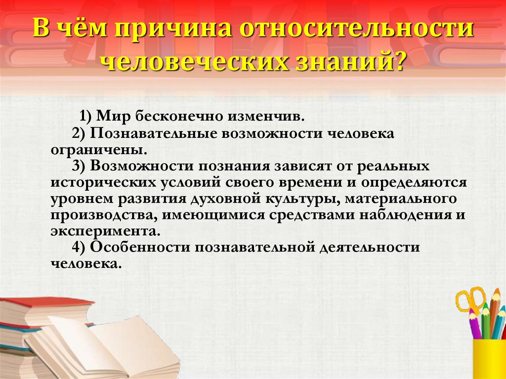 В чём причина относительностичеловеческих знаний?
