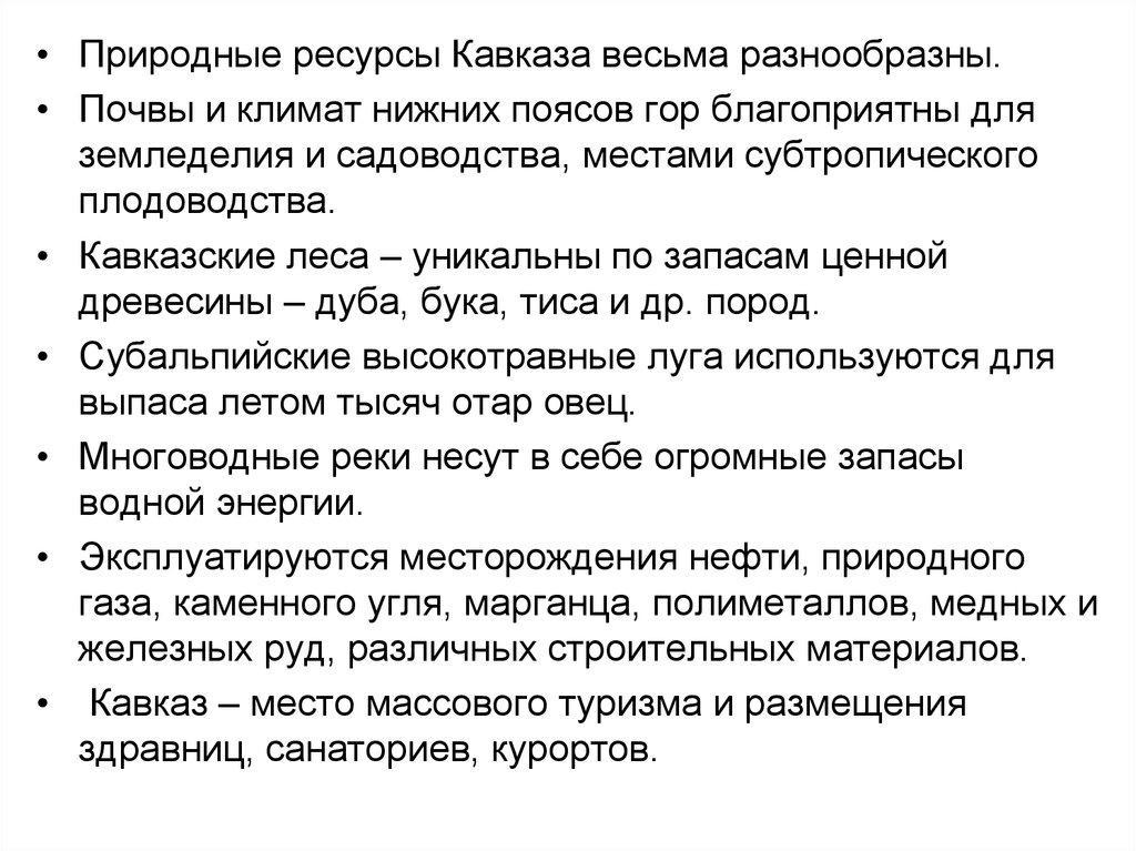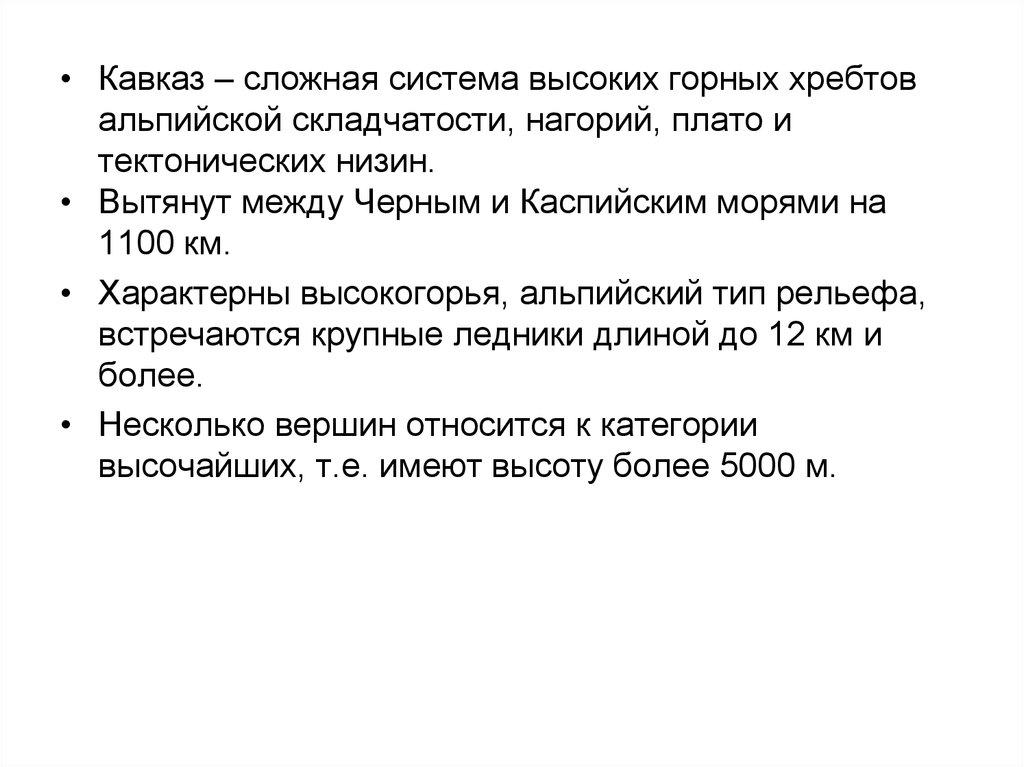 • Кавказ – сложная система высоких горных хребтовальпийской складчатости, нагорий, плато и