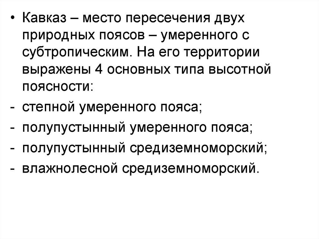 • Кавказ – место пересечения двухприродных поясов – умеренного с