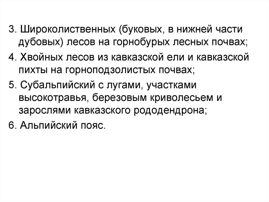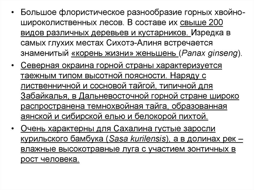 • Большое флористическое разнообразие горных хвойношироколиственных лесов. В составе их свыше 200видов различных деревьев и кустарников. Изредка в