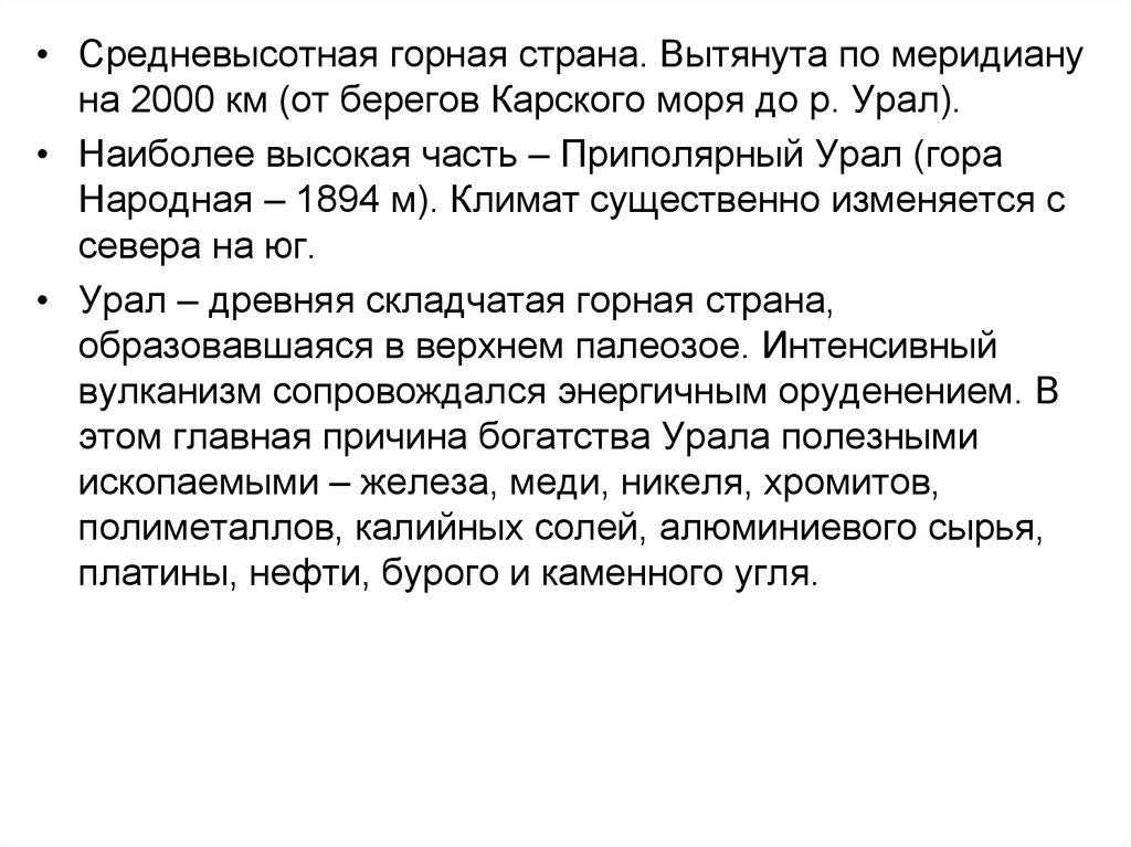 • Средневысотная горная страна. Вытянута по меридиануна 2000 км (от берегов Карского моря до р. Урал).