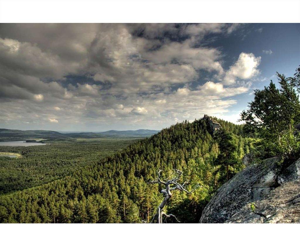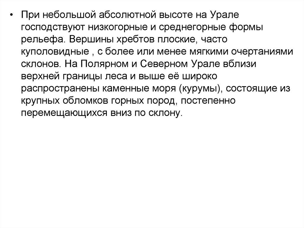 • При небольшой абсолютной высоте на Уралегосподствуют низкогорные и среднегорные формы