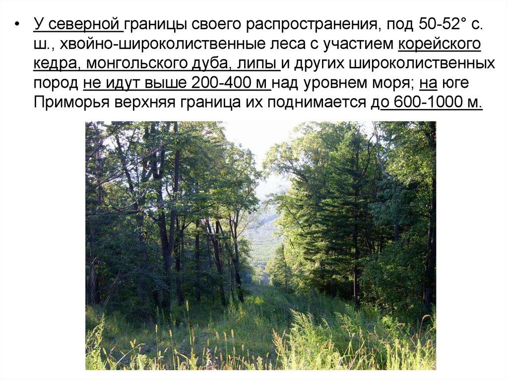 • У северной границы своего распространения, под 50-52° с.ш., хвойно-широколиственные леса с участием корейского