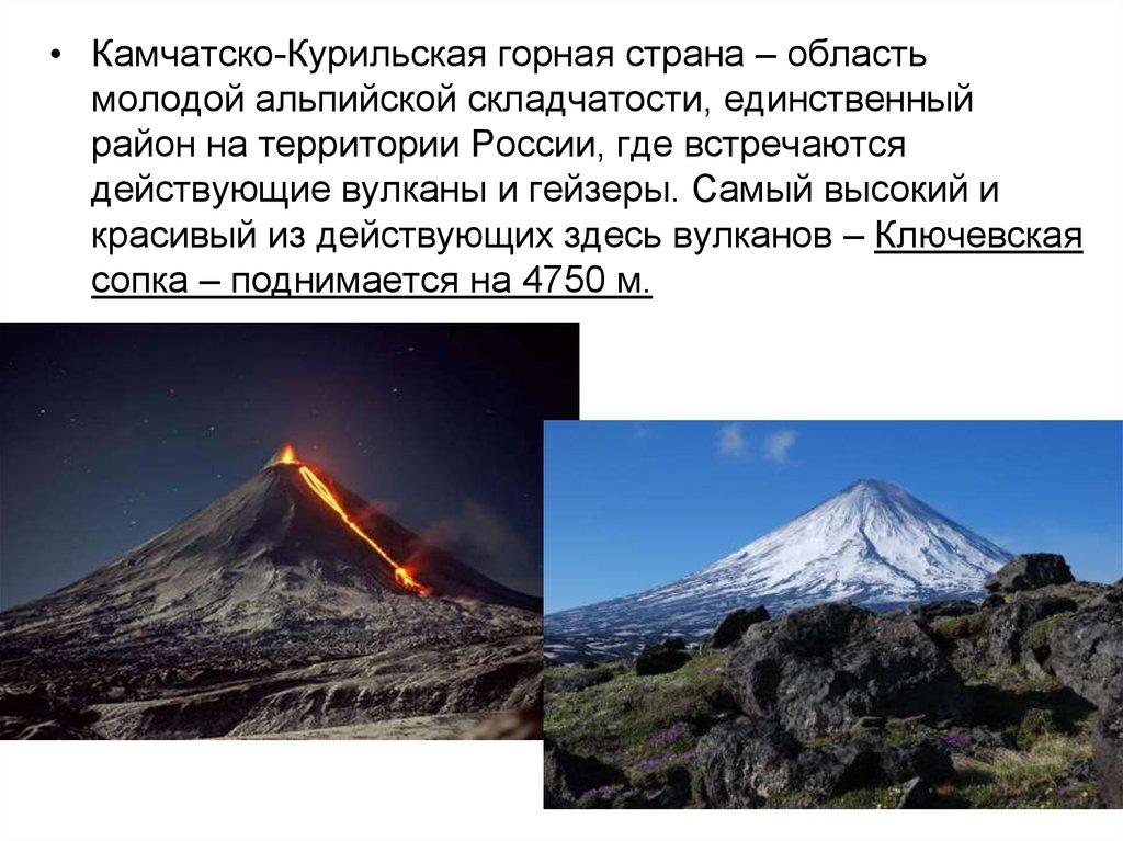 • Камчатско-Курильская горная страна – областьмолодой альпийской складчатости, единственный