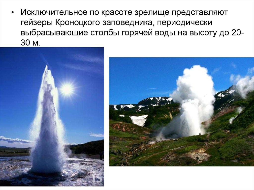 • Исключительное по красоте зрелище представляютгейзеры Кроноцкого заповедника, периодически