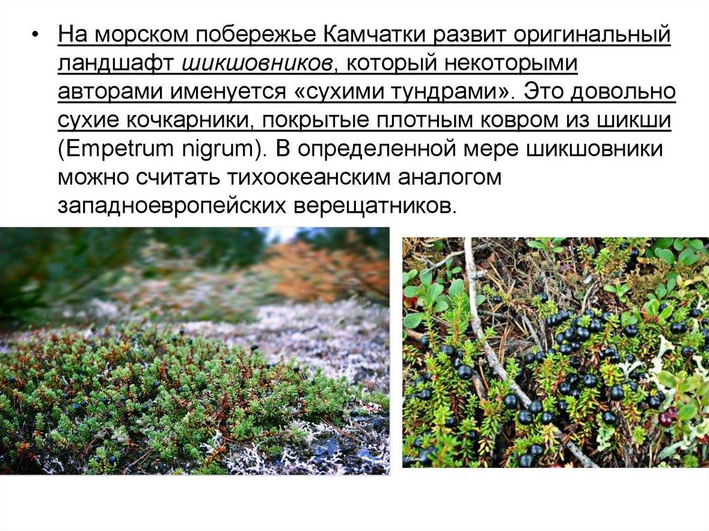 • На морском побережье Камчатки развит оригинальныйландшафт шикшовников, который некоторыми