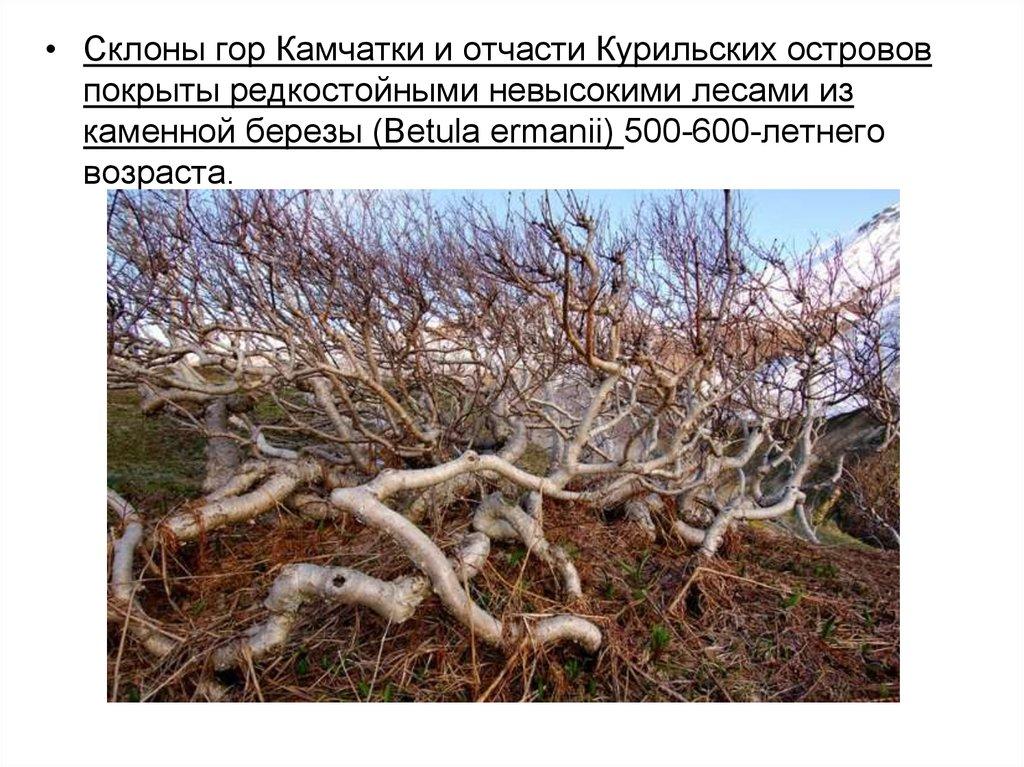 • Склоны гор Камчатки и отчасти Курильских острововпокрыты редкостойными невысокими лесами из
