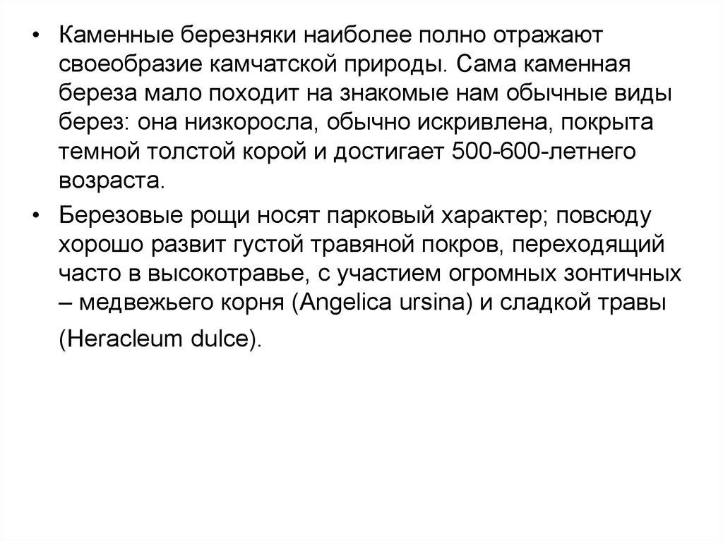 • Каменные березняки наиболее полно отражаютсвоеобразие камчатской природы. Сама каменная