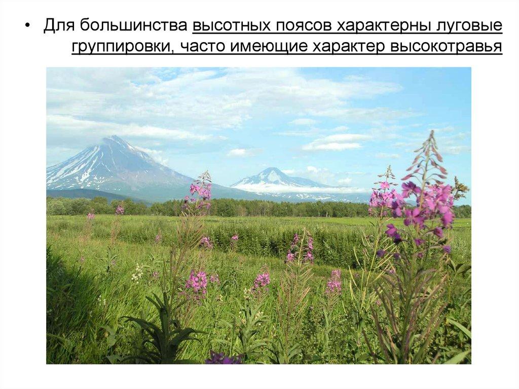 • Для большинства высотных поясов характерны луговыегруппировки, часто имеющие характер высокотравья