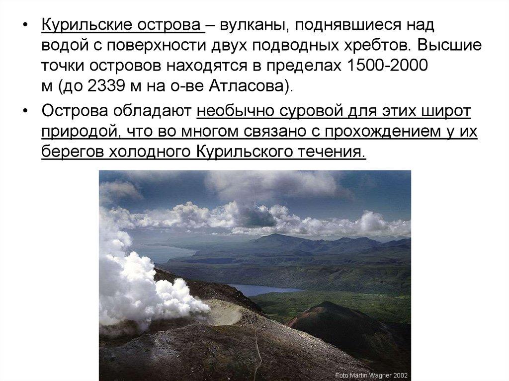 • Курильские острова – вулканы, поднявшиеся надводой с поверхности двух подводных хребтов. Высшие