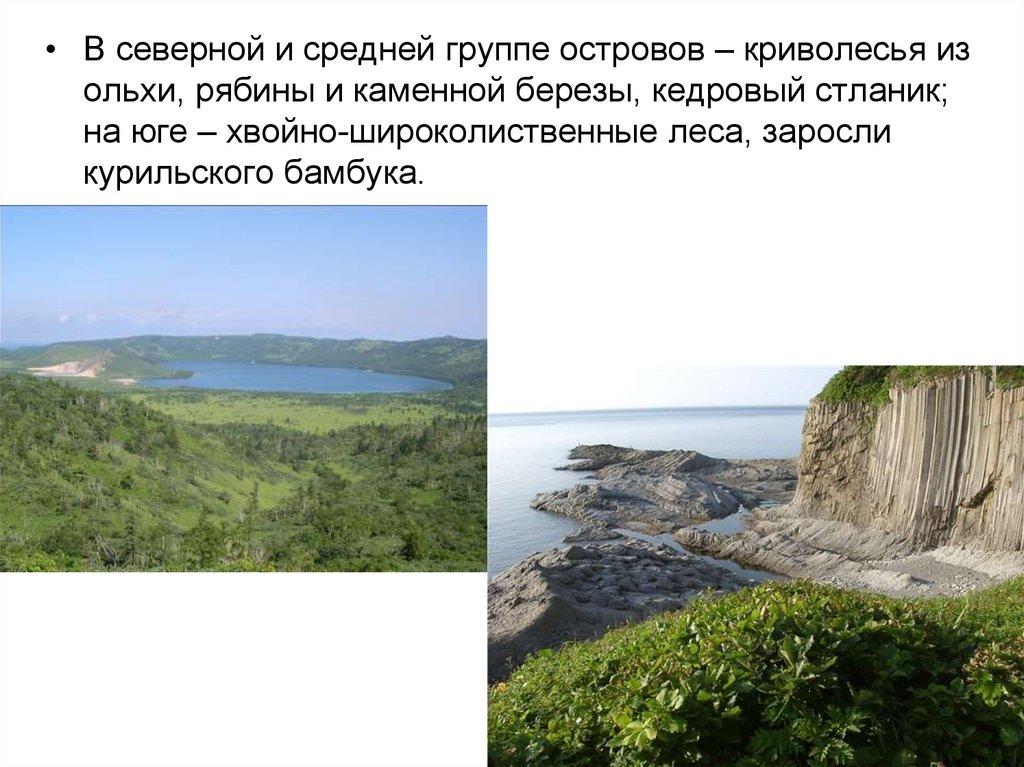 • В северной и средней группе островов – криволесья изольхи, рябины и каменной березы, кедровый стланик;