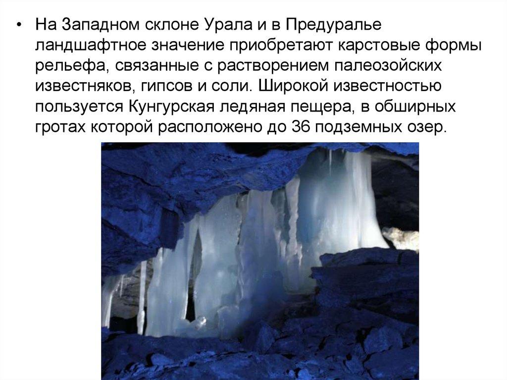 • На Западном склоне Урала и в Предуральеландшафтное значение приобретают карстовые формы