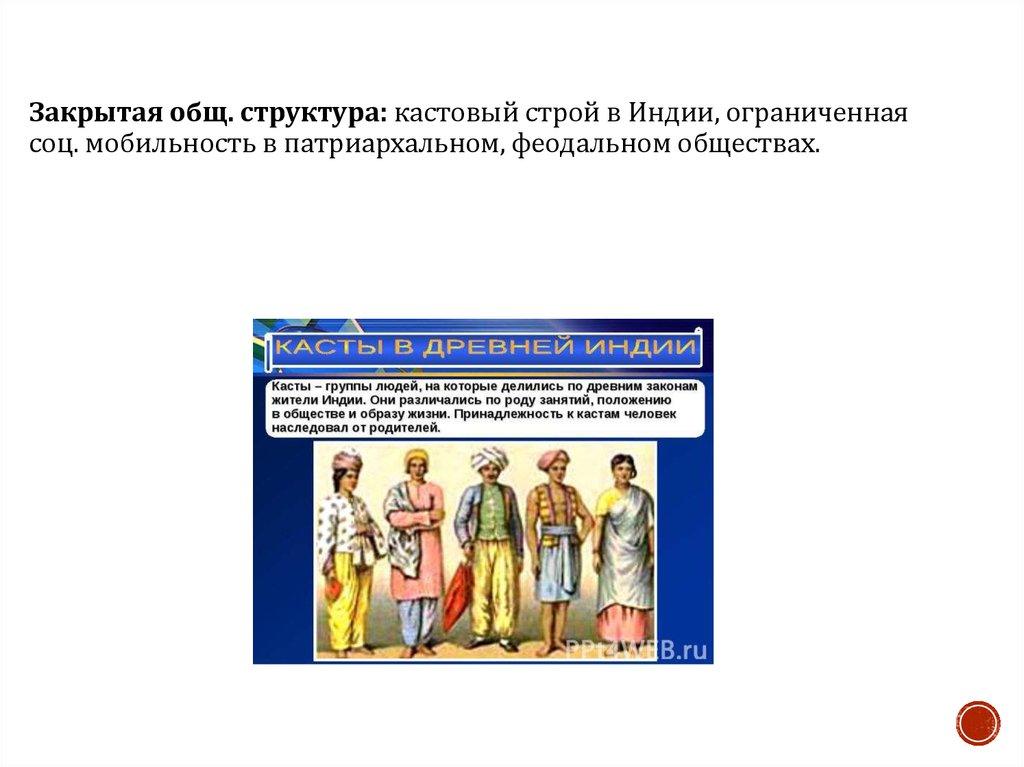 Закрытая общ. структура: кастовый строй в Индии, ограниченнаясоц. мобильность в патриархальном, феодальном обществах.