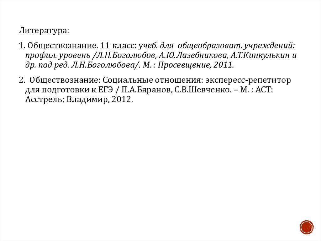 Литература:1. Обществознание. 11 класс: учеб. для общеобразоват. учреждений: