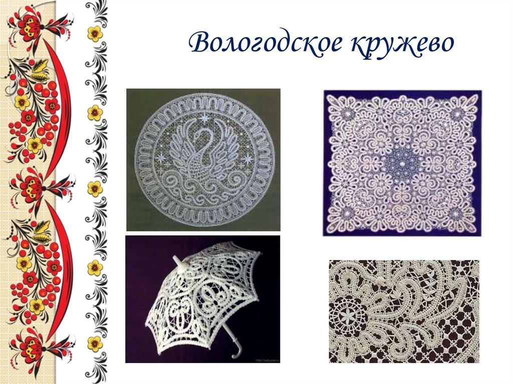 Вологодское кружево33. Вологодское кружево - вид русского кружева, плетённого на коклюшках (деревянных палочках), распространённый