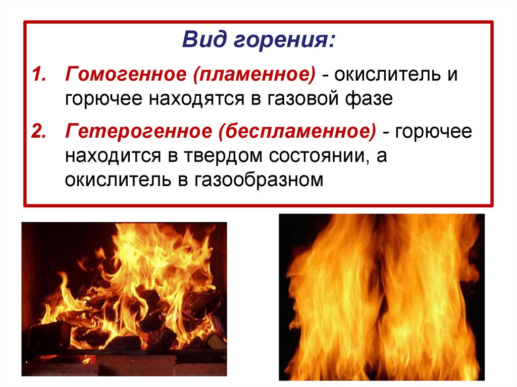 Вид горения:1. Гомогенное (пламенное) - окислитель и