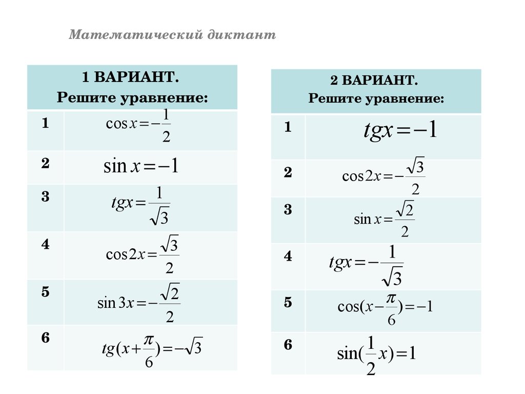 26. Математический диктант №5 по теме «Простейшие тригонометрические уравнения»