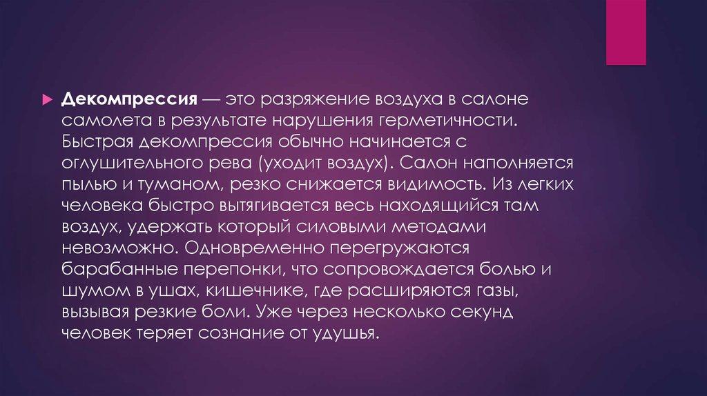 Декомпрессия — это разряжение воздуха в салонесамолета в результате нарушения герметичности.