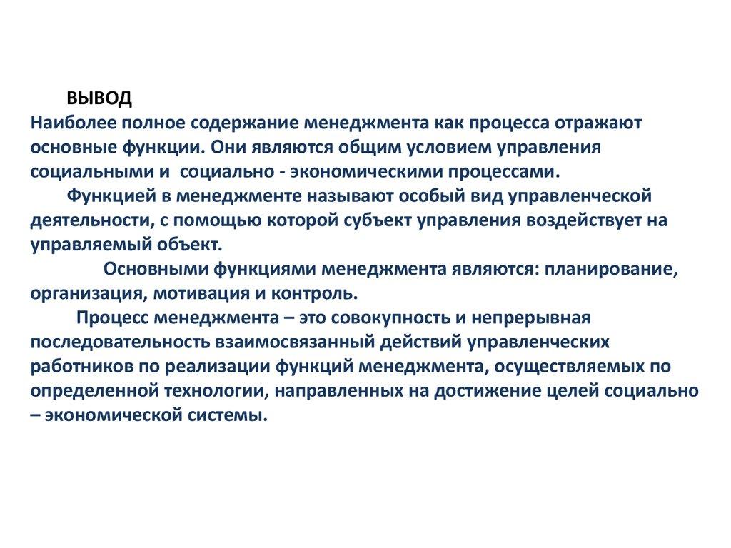 ВЫВОДНаиболее полное содержание менеджмента как процесса отражают