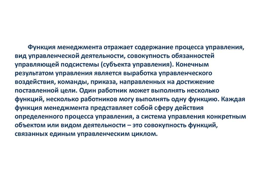 Функция менеджмента отражает содержание процесса управления,вид управленческой деятельности, совокупность обязанностей