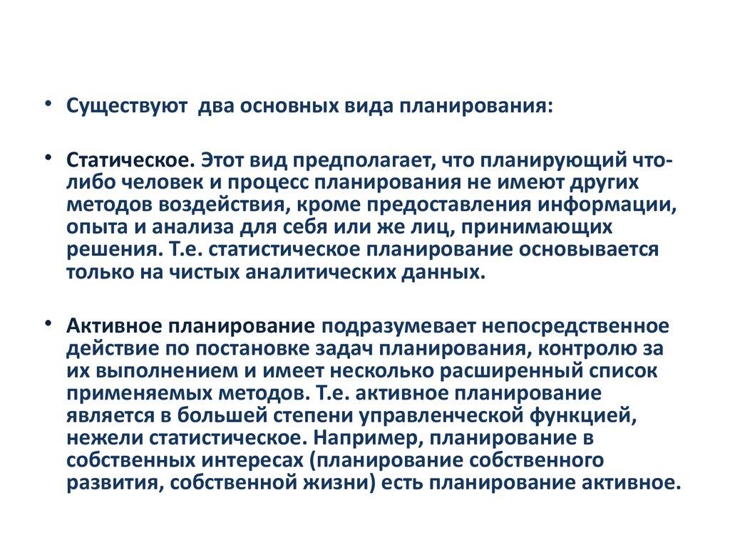 • Существуют два основных вида планирования:• Статическое. Этот вид предполагает, что планирующий чтолибо человек и процесс планирования не имеют других