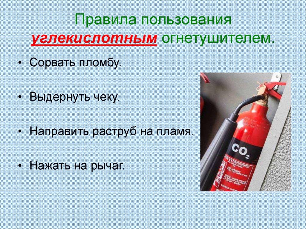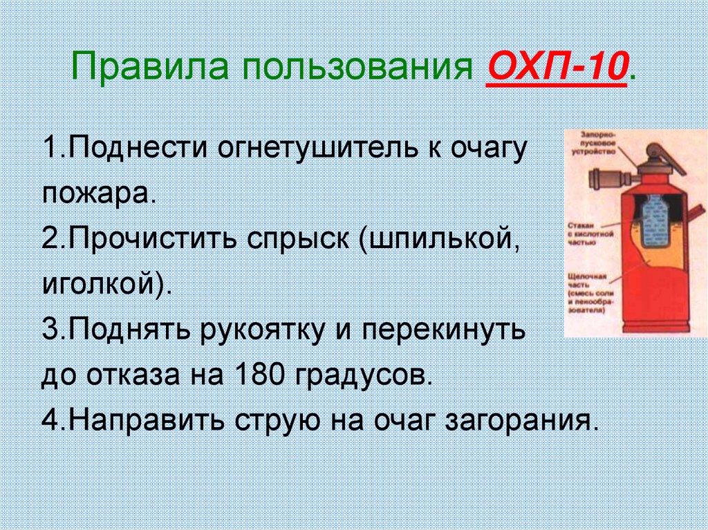 Правила пользования ОХП-10.1.Поднести огнетушитель к очагу