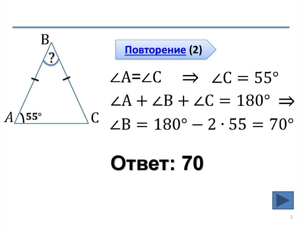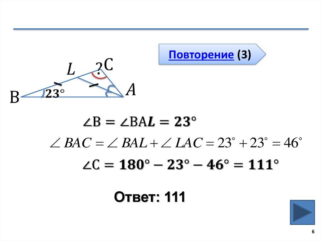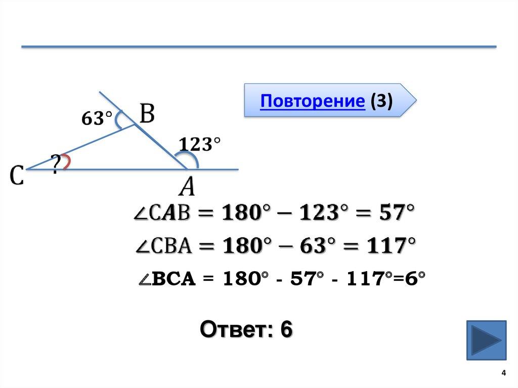 Повторение (3)∠ВСА = 180° - 57° - 117°=6°