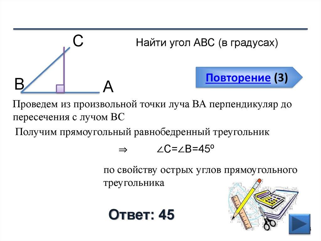 ⇒ ∠С=∠В=45⁰ по свойству острых углов