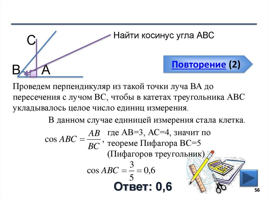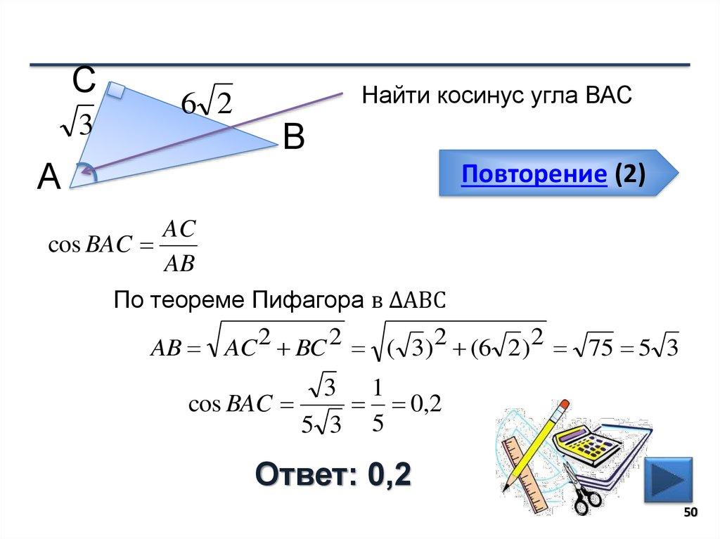 Косинусом острого угла прямоугольноготреугольника называется отношение