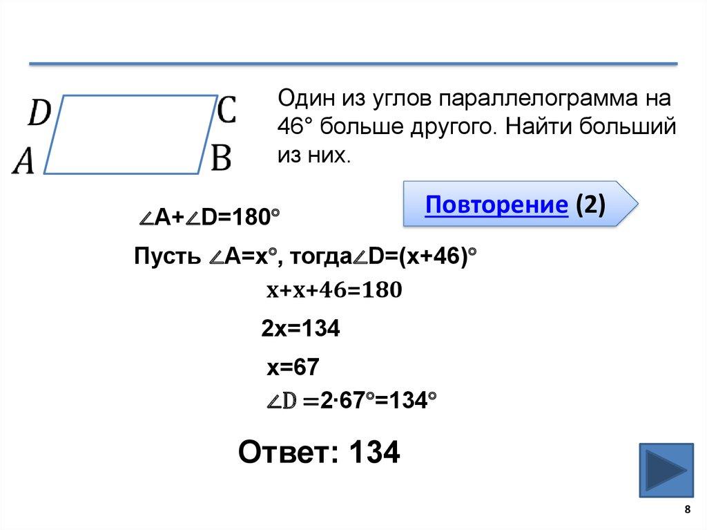 Один из углов параллелограмма на46° больше другого. Найти больший