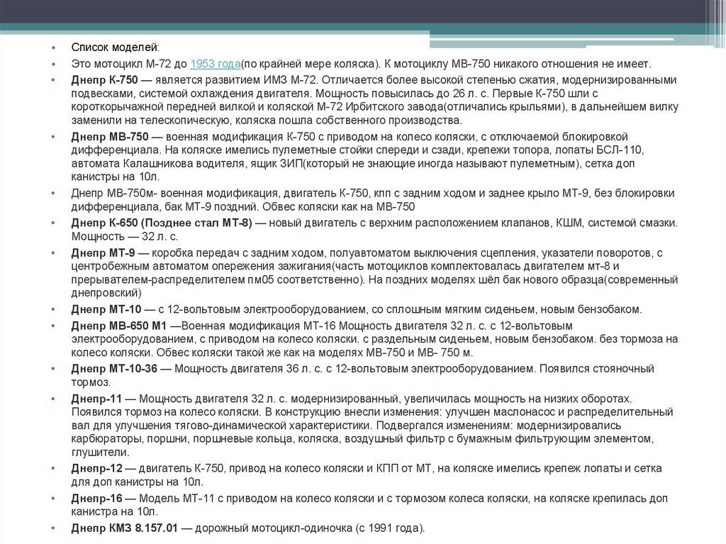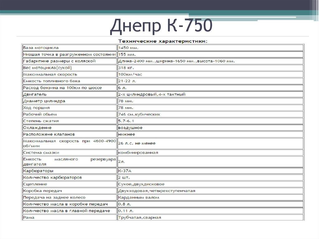 Днепр К-750 — является развитием ИМЗ М-72. Отличается более высокой степенью сжатия, модернизированными