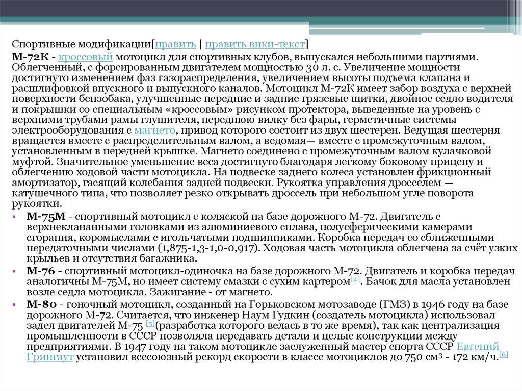 Спортивные модификации[править | править вики-текст]М-72К - кроссовый мотоцикл для спортивных клубов, выпускался небольшими партиями.