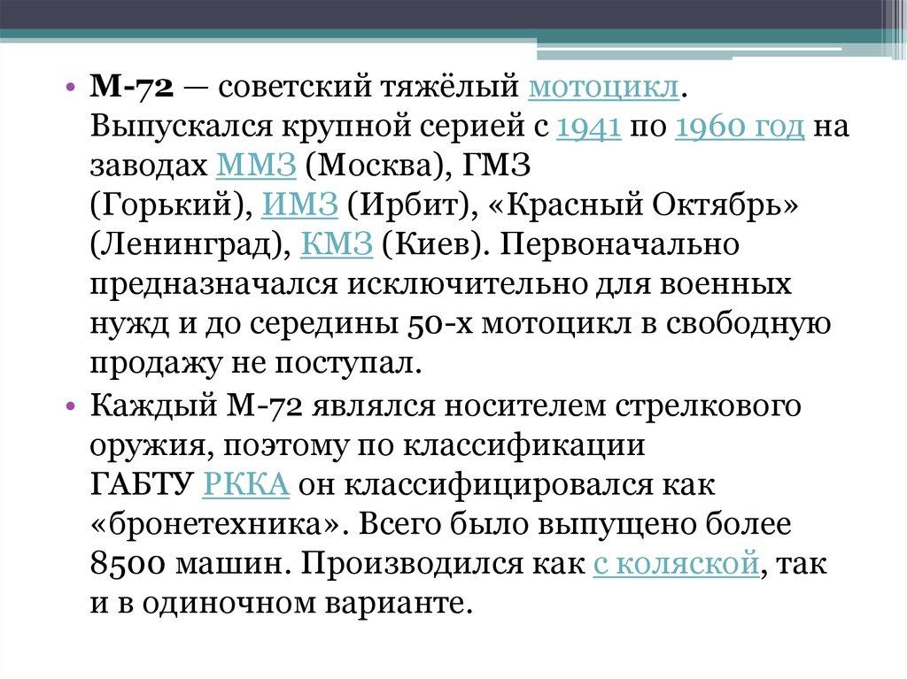 • М-72 — советский тяжёлый мотоцикл.Выпускался крупной серией с 1941 по 1960 год на
