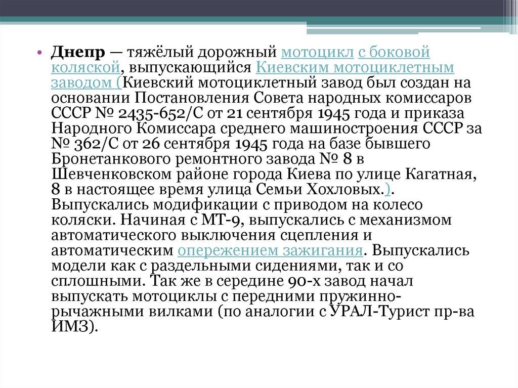 • Днепр — тяжёлый дорожный мотоцикл с боковойколяской, выпускающийся Киевским мотоциклетным