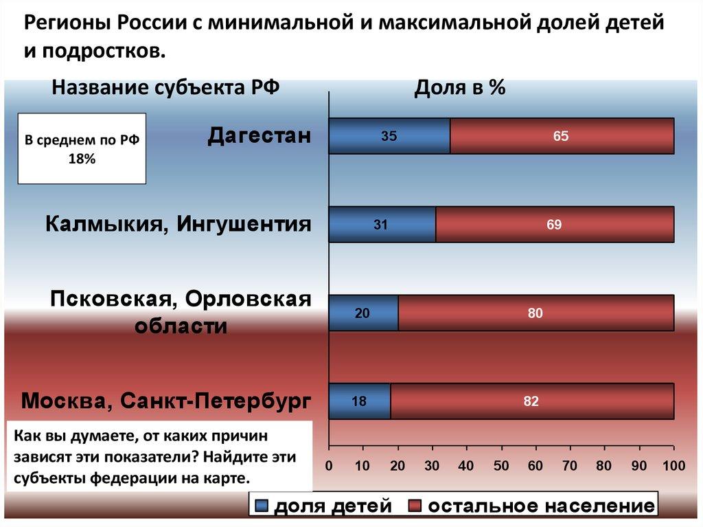 Регионы России с минимальной и максимальной долей детейи подростков.