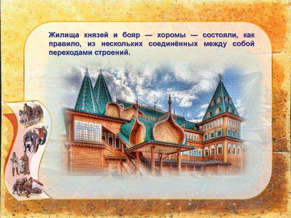Жилища князей и бояр — хоромы — состояли, какправило, из нескольких соединённых между собой